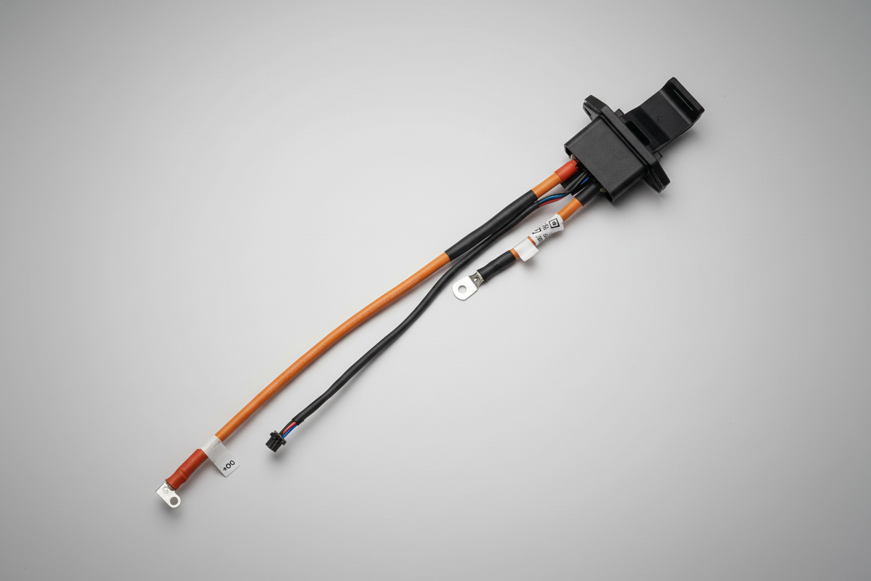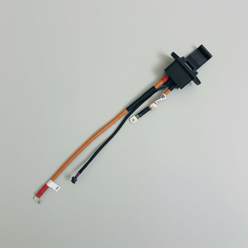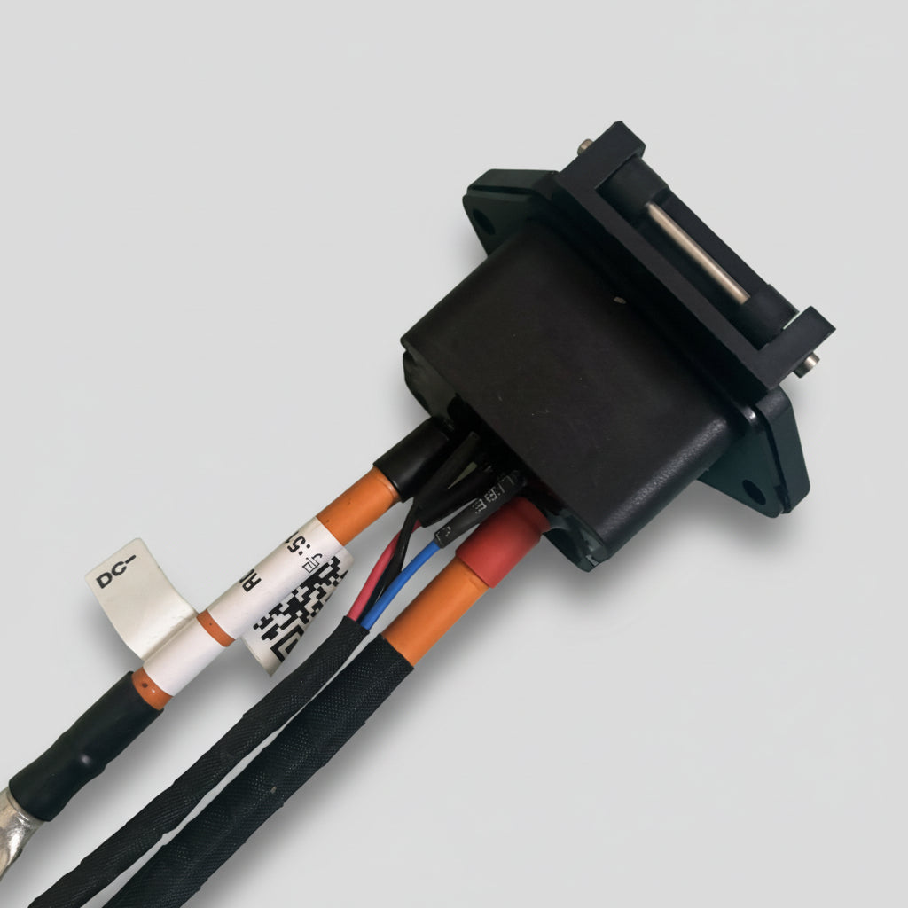 Featuring a robust design with extended cable lengths, this harness connects the external charging port to the internal battery cells. It includes heavy-duty DC+ and DC- power cables terminated with secure ring lugs, along with the essential signal/data connector for BMS communication. This is the critical component required if your battery's physical connector or internal wiring has sustained damage.